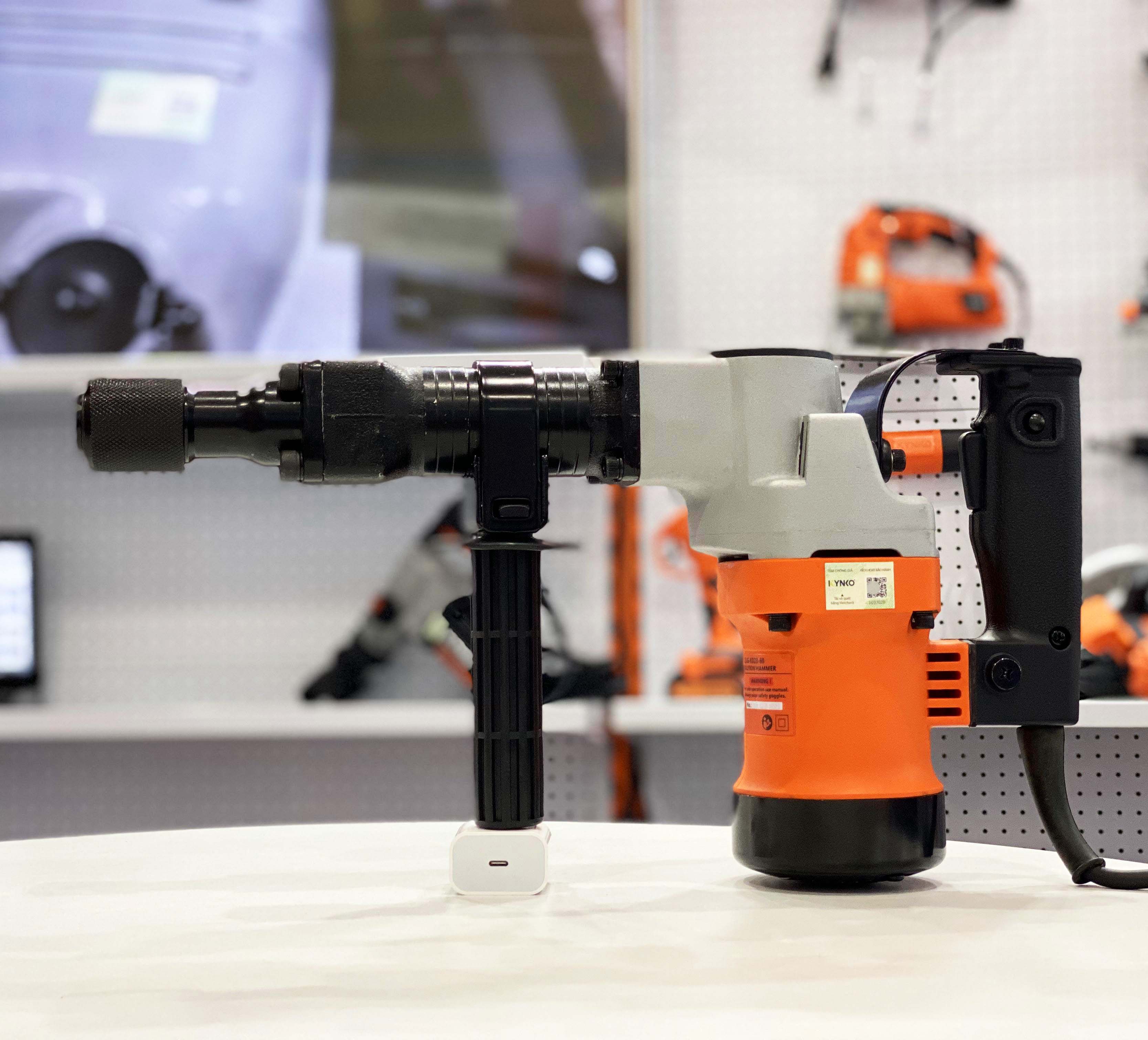 + Giữ chắc máy và điều chỉnh mũi đục: Giữ máy đục chắc chắn, bật công tắc và tạo áp lực từ từ lên bức tường.