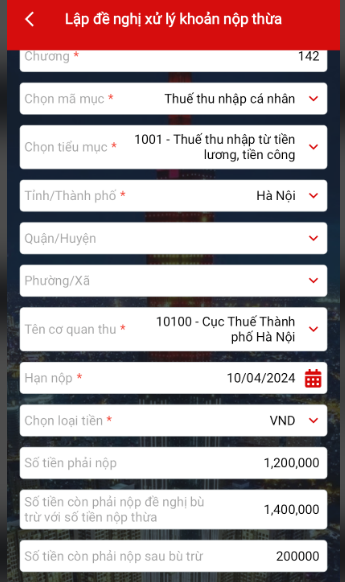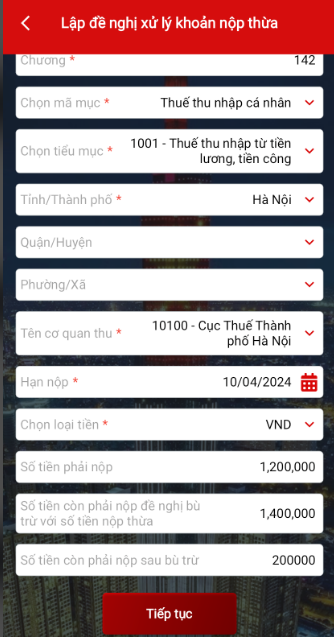 + Bước 4: Điền các thông tin của người làm đơn đề nghị xử lý khoản nộp thừa -> Chọn "Tiếp tục"