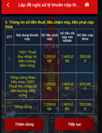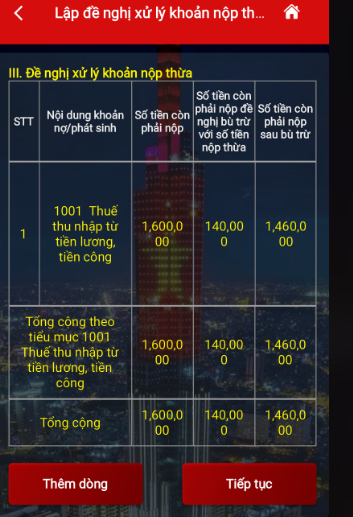 + Bước 7: Xác minh lại thông tin các khoản đề nghị xử lý khoản nộp thừa -> Chọn "Tiếp tục"