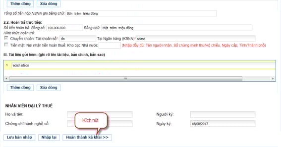 + Bước 5: Chọn "Hoàn thành kê khai" sau khi đã nhập đầy đủ dữ liệu.