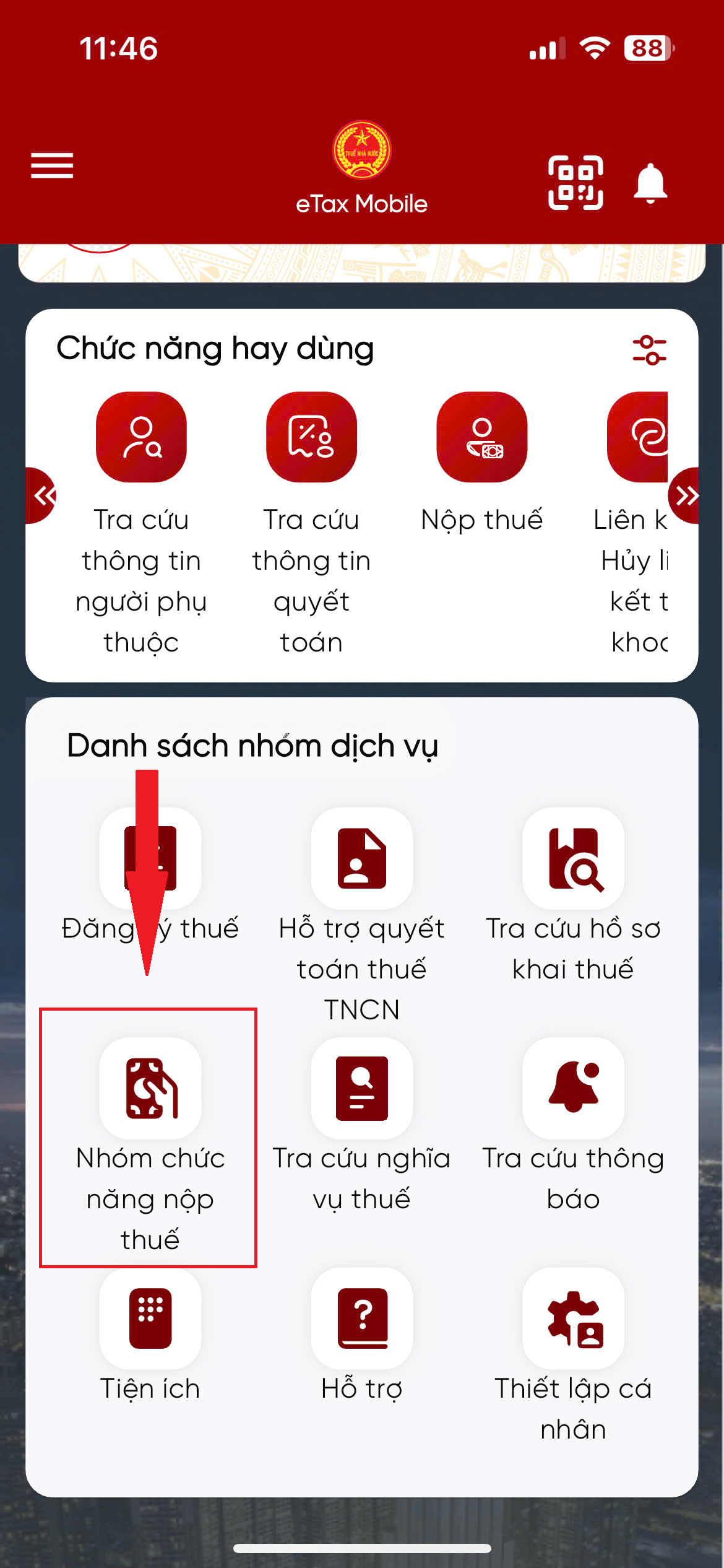 + Bước 1: Đăng nhập ứng dụng eTax Mobile -> Chọn “Nhóm chức năng nộp thuế”