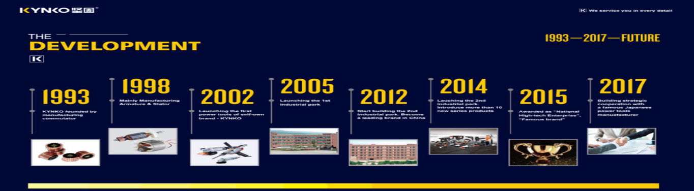 Kynko là nhà sản xuất dụng cụ điện cầm tay (không phải công ty thương mại) của Trung Quốc với bề dày kinh nghiệm từ năm 1993. Không giống như các nhà sản xuất khác, chúng tôi bắt đầu với việc sản xuất phụ tùng thay thế, chẳng hạn như cổ góp và phần ứng, giúp chúng tôi làm chủ một phần công nghệ cốt lõi của dụng cụ điện cầm tay. Trên cơ sở đó, năm 2002, dây chuyền sản xuất đầu tiên chính thức được khởi động.