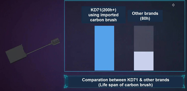 Kynko KD71 sử dụng chổi than thương hiệu Nhật Bản và Đức, tuổi thọ có thể lên tới hơn 350 giờ.