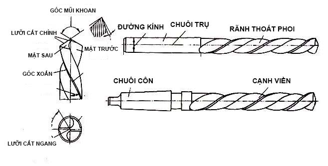 Đây là phần đầu của mũi khoan, được sử dụng để cắt và tạo lỗ. Đầu khoan thường làm từ thép tốt hoặc carbide cứng để đảm bảo độ cứng và độ sắc của lưỡi khoan.