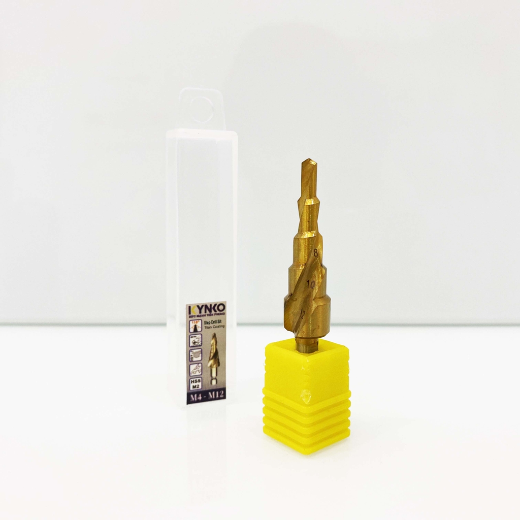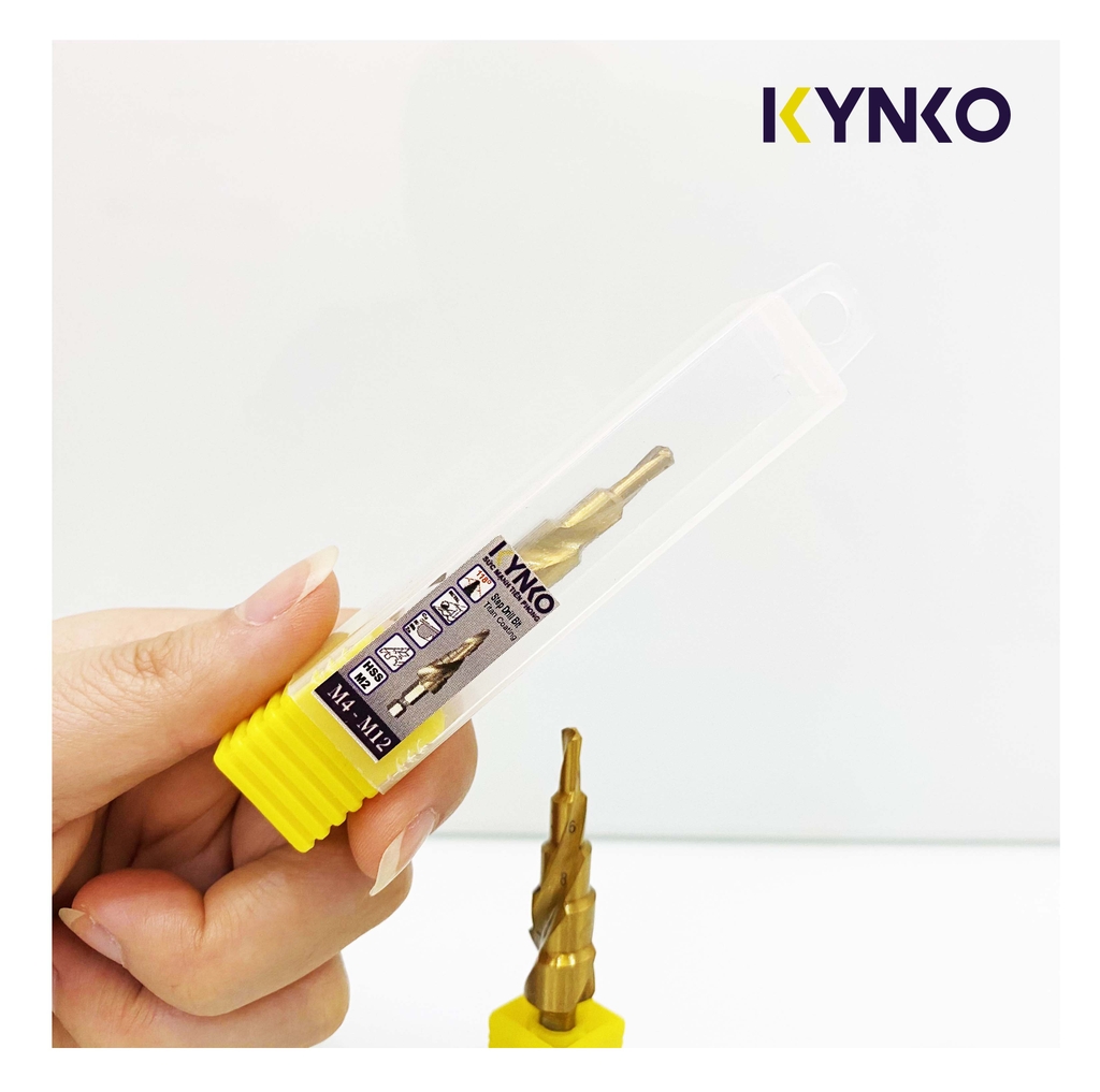 MŨI KHOAN THÁP 4-12 KYNKO HSS-M2 Mũi khoan tháp Kynko (hay còn gọi là Mũi khoan bậc) được làm từ vật liệu thép gió HSS-M2 (High Speed Steel) tương ứng mác thép gió HSS-6542.