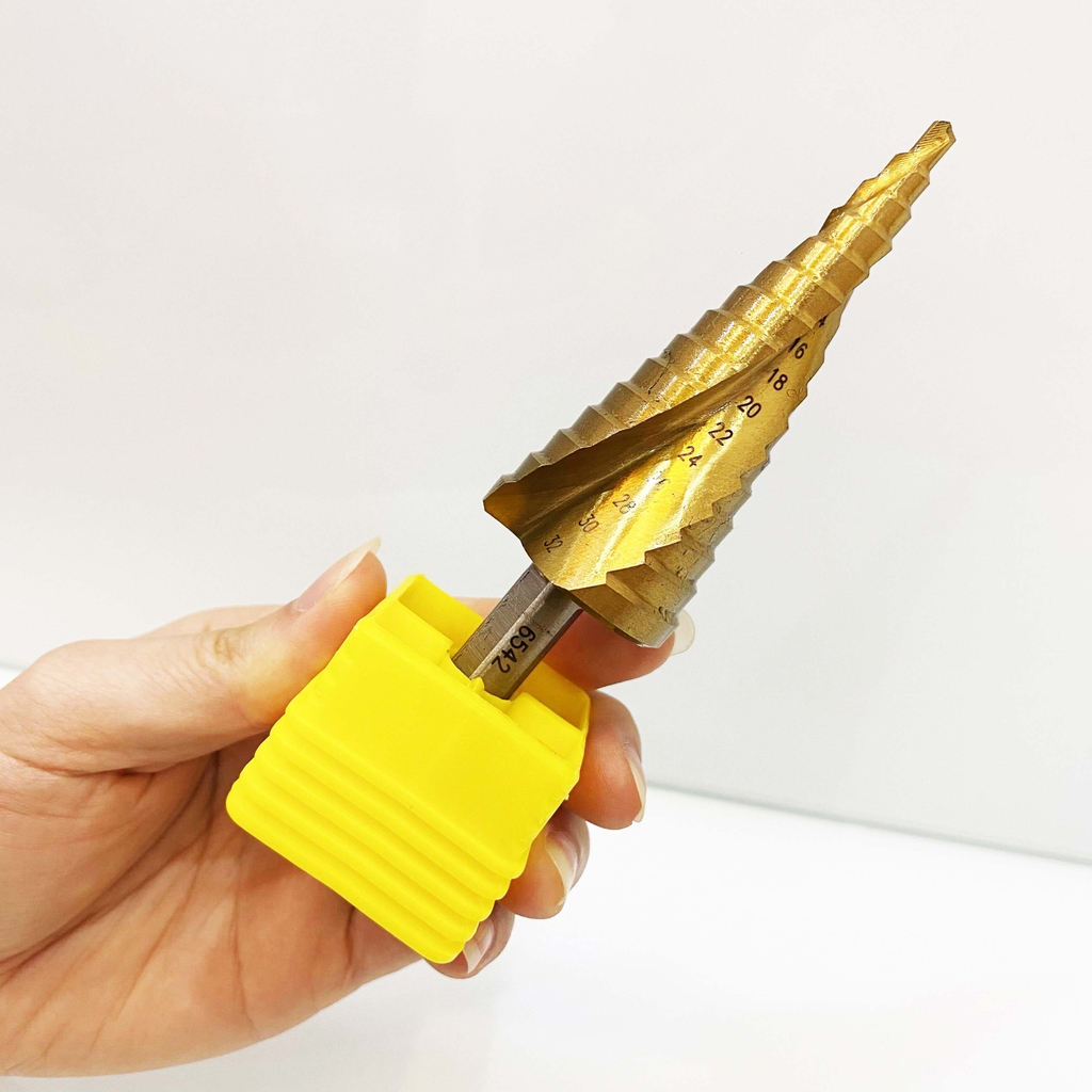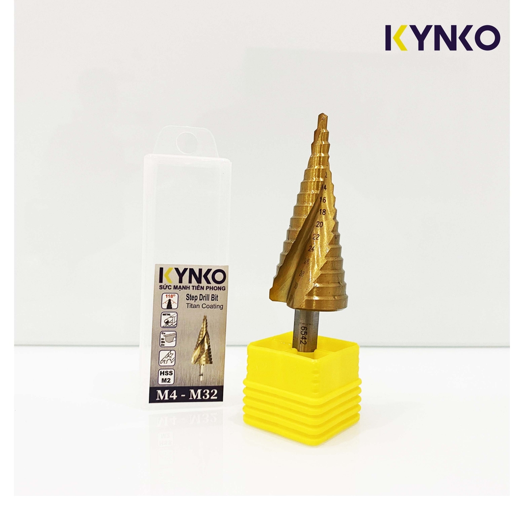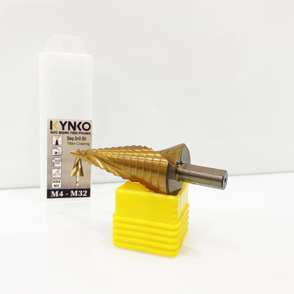 MŨI KHOAN THÁP 4-32 KYNKO HSS-M2 Mũi khoan tháp Kynko (hay còn gọi là Mũi khoan bậc) được làm từ vật liệu thép gió HSS-M2 (High Speed Steel) tương ứng mác thép gió HSS-6542.
