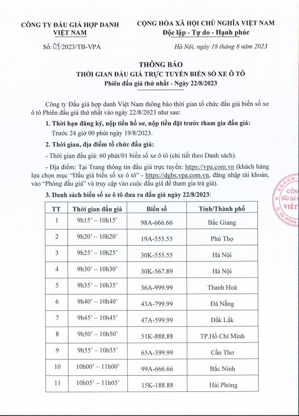 Trước đó, thông tin về thời gian và địa điểm tổ chức buổi đấu giá đầu tiên đã được thông báo chính thức như sau: